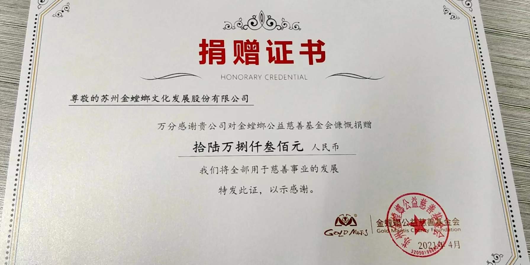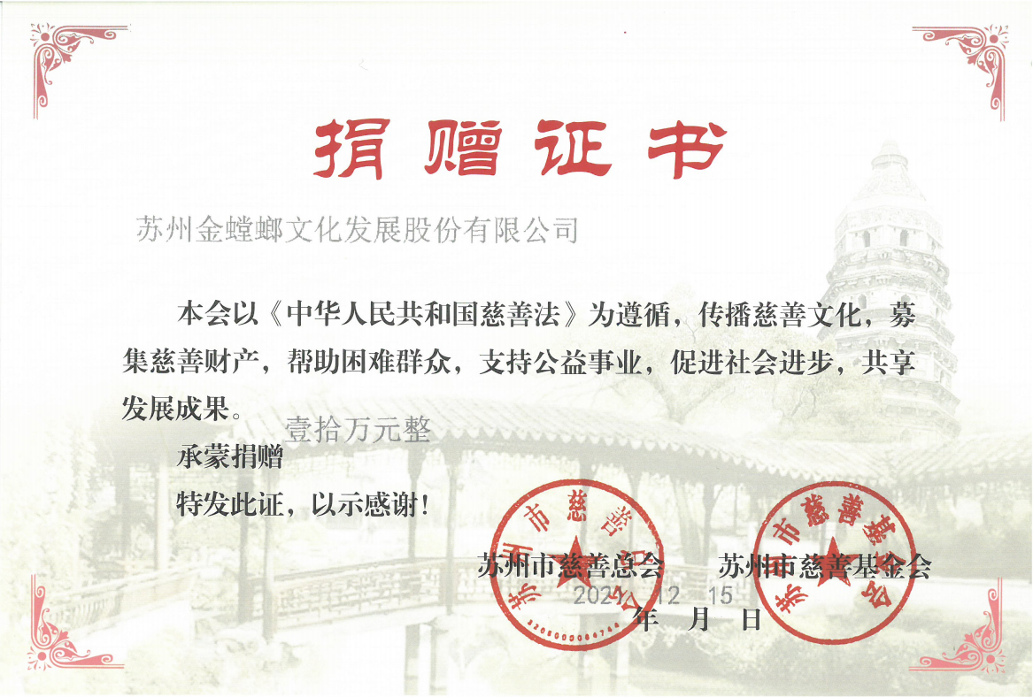 凝聚慈善力量,履行企業(yè)社會責任。金螳螂文化將持續(xù)投身公益事業(yè),以責任之心助力事業(yè)發(fā)展,真誠回饋社會,身體力行為社會創(chuàng)造更大的價值。