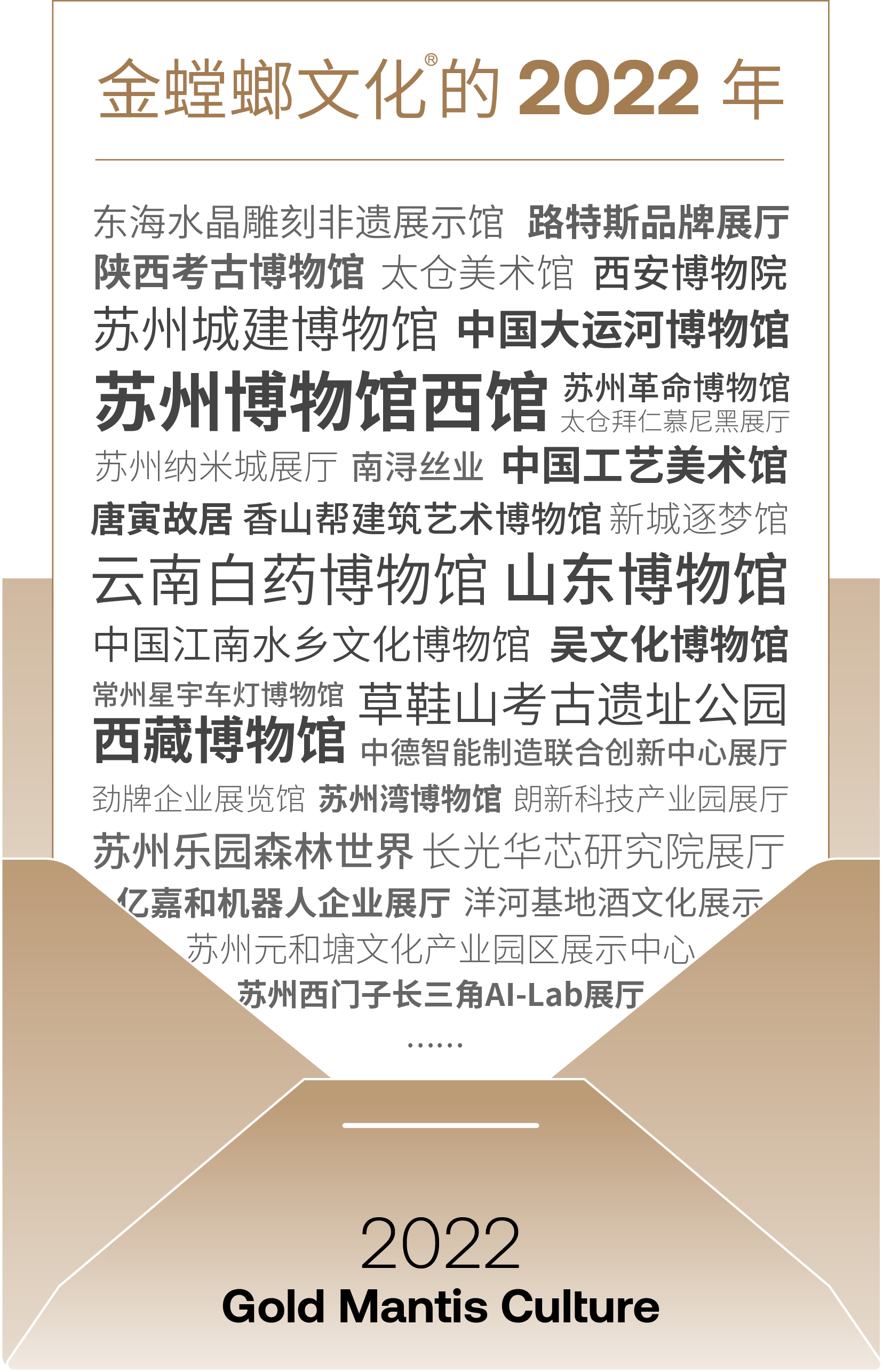從江南水鄉到三秦大地,金螳螂文化詮釋空間故事,打造了數十個全國及各省市重點文化項目,收獲了近40個設計、施工類獎項,得到了業主認可,塑造了“創新質造”的行業口碑。 5·18 國際博物館日,2021年度全國博物館十大陳列展覽精品終評結果公布。 金螳螂文化參與設計施工的“揚州中國大運河博物館常設展覽”喜獲第十九屆(2021年度)全國博物館十大陳列展覽精品獎! 常熟市沙家浜革命歷史紀念館改陳布展項目獲得2021-2022年度中國建筑工程裝飾獎。 溧陽生態創新展示館獲得2022年度建筑裝飾行業科學技術獎科技創新工程獎。 中國建筑裝飾設計獎、美國IDA設計大獎、加拿大GPD設計大獎……金螳螂文化項目的影響力不斷擴大,在實現企業價值增長的同時弘揚優秀中華文化,讓文化會說話。 讓設計更有文化,讓空間更有故事。 多年來,金螳螂文化持續深度探索文化行業,積極推動行業相關標準的編制,推動校企合作,推進產學研共建,愿做文化行業探索者。 努力會被看見,優秀會得到嘉獎,金子終將閃閃發光。 在不完美的現實中,金螳螂文化人發現美,創造美,共同繪就文化的未來。 2022 這一年 我們銳意進取,榮耀相隨 在嶄新的 2023 年 愿突破想象,逐新再創 并肩前行,大展宏“兔” 共筑文化行業的未來!